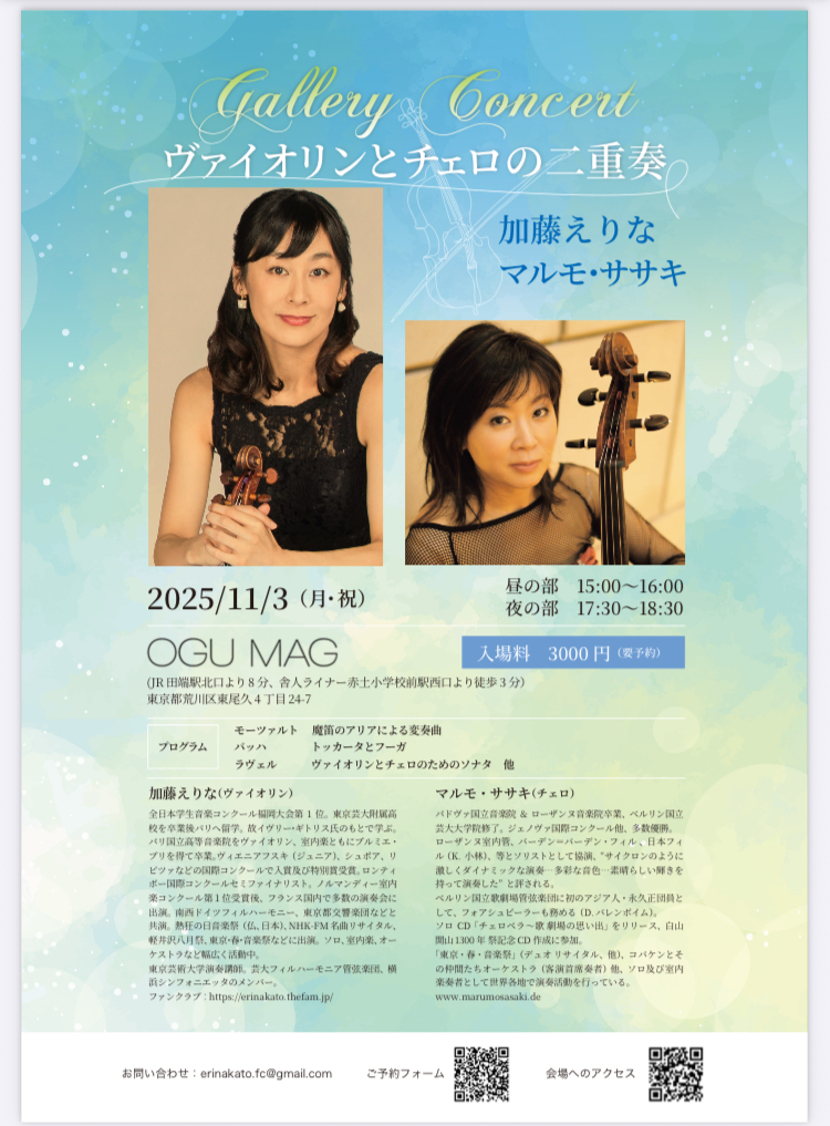 出演: 加藤えりな(ヴァイオリン) マルモ・ササキ(チェロ)